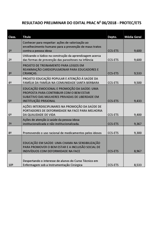 Resultado Preliminar - Edital PRAC Nº 06/2018 ETS