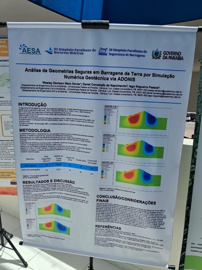 Durante o evento, Wesley apresentou a pesquisa intitulada “Análise de Geometrias em Barragens de Terra por Simulação Numérica Geotécnica via Adonis”, desenvolvida no âmbito do PRH 35 ANP/UFPB, sob orientação do Prof. Dr. Igor Fernandes Gomes (CT/UFPB).