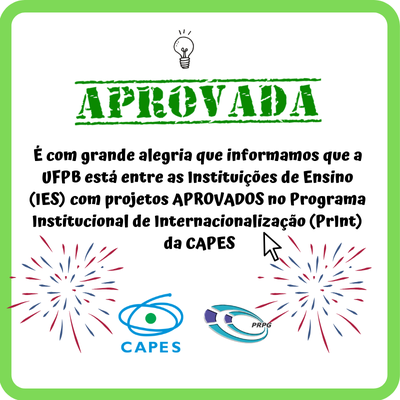 É com grande alegria que informamos que a UFPB está entre as Instituições de Ensino (IES) com projetos APROVADOS no Programa Institucional de Internacionalização (PrInt) da CAPES (ver relação em anexo).